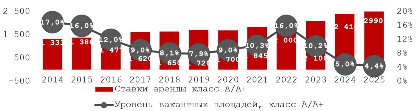 Отчет по рынку офисной недвижимости Санкт-Петербурга по итогам 2025 года подготовила консалтинговая компания IPG.Estate. Предложение Рынок офисной недвижимости в 2025 году продемонстрировал положительную динамику, объем нового предложения составил 174 тыс. кв. метров. Суммарная площадь качественной офисной недвижимости составляет 5,29 млн. кв. метров. Достигнутые показатели по вводу объектов частично обеспечены за счет сдачи объектов с перенесенными сроками. Следует отметить, что объем нового предложения на спекулятивном рынке составил всего 56 тыс. кв. метров. Это объясняется тем, что значительная часть введенных площадей уже законтрактована, как БЦ «Северная пальмира», а финальные очереди БЦ «Невская Ратуша» строились с перспективой полного выкупа их администрацией города. Динамика прироста качественных офисных площадей, тыс. кв.м Ставки аренды и уровень вакансии Арендные ставки на офисную недвижимость демонстрируют уверенный рост. В классе А/А+ средняя ставка с начала года увеличилась на 24%, до 2 990 рублей за кв. метр в месяц, в классе B/В+ — на 10%, до 1 983 рублей за кв. метр в месяц (включая НДС и операционные расходы). Динамика арендных ставок на Невском проспекте, Петроградской стороне отличается от той, что наблюдается на помещения в офисных объектах в спальных районах. Разница в ставках может достигать 10-15 %. В 2025 году показатель вакансии вырос до 4%, что на 0,8 процентных пункта выше, чем годом ранее. Небольшая коррекция обусловлена сочетанием факторов предложения и спроса. Со стороны предложения, на рынок вышли как освободившиеся площади, так и новые объекты, введенные в эксплуатацию. Со стороны спроса, замедление деловой активности и повышение арендных ставок привели к снижению темпов поглощения, что в итоге и привело к росту показателя вакансии. Дефицит нового предложения ставит арендаторов в сложное положение: им приходится продлевать договоры на условиях роста, в то время как поиск адекватной замены практически невозможен из-за отсутствия качественных вариантов на рынке. Динамика ставок аренды и уровня вакансии, класс А/А+ Спрос Спрос на аренду и покупку помещений в 2025 году существенно снизился, число сделок в сравнении с 2024 годом, сократилось. Основные сделки в 2025 году по-прежнему состоялись с компаниями из нефтегазовой отрасти, IT-сферы. Стоит отметить, что в целом, их активная экспансия прошлого периода сменилась на точечную консолидацию. В 2025 году заметно выделились производственные компании. Доля приобретенных и арендованных ими площадей составила 15% от общего объема сделок. В последние годы, помимо приобретения офисных площадей для собственного использования, наблюдается рост активности в сфере прямых инвестиций. Увеличилось количество сделок по покупке бизнес-центров с целью их последующего девелопмента, будь то дальнейшее развитие офисных площадей или изменение функционального назначения объекта. Также на рынке офисной недвижимости проходят сделки по продаже активов инвесторам с одновременным заключением договора долгосрочной аренды, что часто применяется компаниями для оптимизации своей долговой нагрузки. Рынок гибких офисов Спрос на гибкие пространства сохранился, но сконцентрировался исключительно в высококлассных БЦ и центральных локациях. В то же время, аренда в бюджетных коворкингах и на периферии 